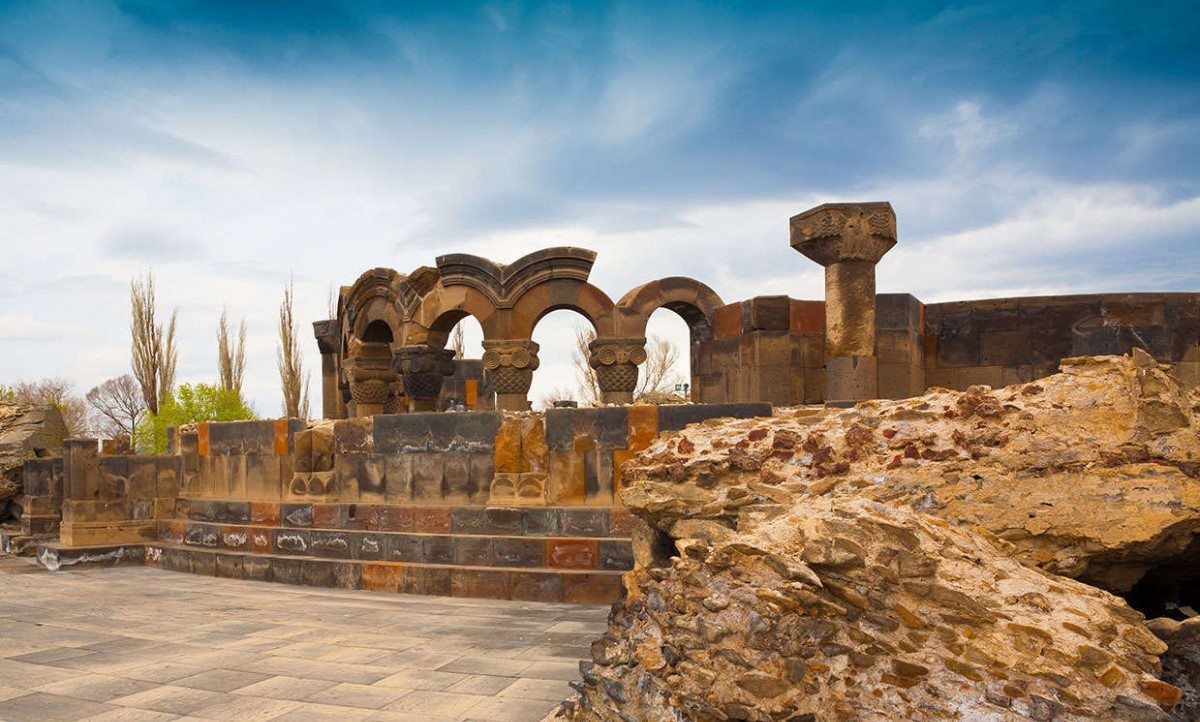 Zvartnots temple was built in 7-th century, at a time when much of Armenia was under Byzantine control or influence and during the early invasions of Armenia by the Muslim Arabs. Unfortunately, like the majority of other ancient Armenian temples, Zvartnots has survived only in ruins since it was completely destroyed by powerful earthquake in the 10 th century. But even the ruins of this temple give us the idea of its rare and majestic beauty.